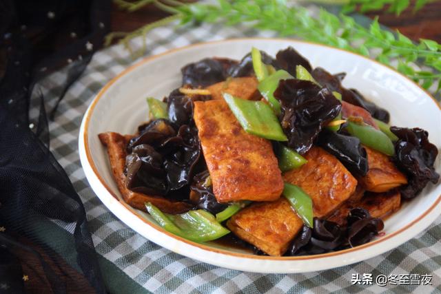【豆腐烧木耳】材料:北豆腐1块、木耳(干)50克、尖椒1根、油盐适量、葱1段、姜2片、蚝油1汤匙、生抽1汤匙、水淀粉适量、