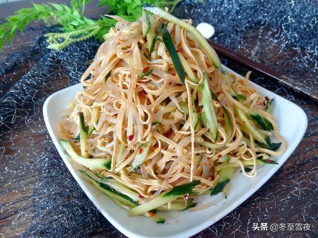 【家常凉菜】材料:黄瓜2根、干豆腐3张、绿豆芽300克、粉丝1把、盐适量、辣椒油1汤匙、香油1汤匙、大蒜3瓣、白糖1汤匙、米醋3汤匙、生抽2汤匙、