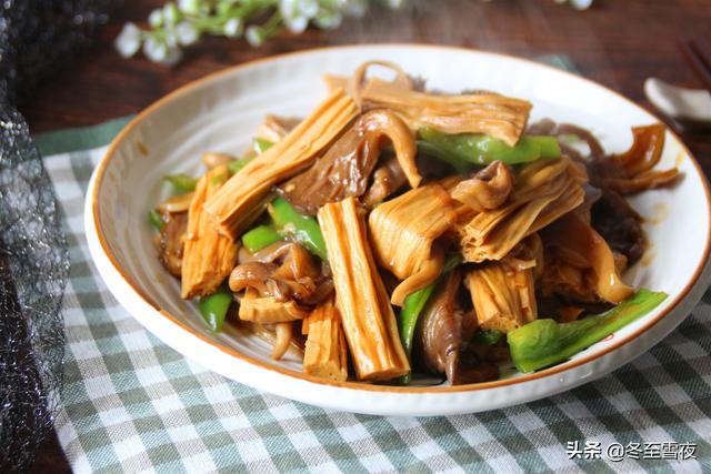 【腐竹烧平菇】材料:腐竹(干)150克、平菇250克、尖椒1个、油盐适量、葱1段、姜1片、大蒜2瓣、生抽1汤匙、白糖1茶匙、水淀粉适量。
