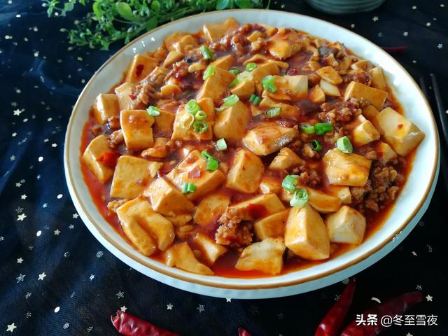 【肉末豆腐】材料:北豆腐1块、猪肉150克、油盐适量、郫县豆瓣酱1汤匙、葱1段、姜1片、大蒜2瓣、花椒适量,料酒1汤匙、酱油1汤匙、白糖1/3汤匙、水淀粉适量、