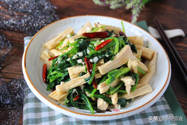 【腐竹拌菠菜】材料:腐竹(干)150克、菠菜300克、植物油适量、香油1汤匙、盐适量、大蒜2瓣、花椒1汤匙、干辣椒6个、白糖1汤匙、米醋1汤匙、