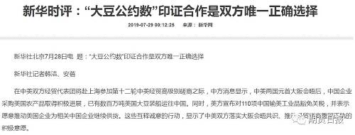 今日凌晨,新华社发布时评:“大豆公约数”印证合作是双方唯一正确选择。文章指出,在中美双方经贸代表团将赴上海参加第十二轮中美经贸高级别磋商之际,中方消息显示,中美两国元首大阪会晤后,中国企业采购美国农产品取得积极进展,已有数百万吨美国大豆装船运往中国。同时,美方宣布对110项中国输美工业品豁免关税,并表示愿意推动美国企业为相关中国企业继续供货。这些互释诚意的行动,显示了中美双方落实大阪会晤共识、推动经贸磋商重回正轨的积极意愿。