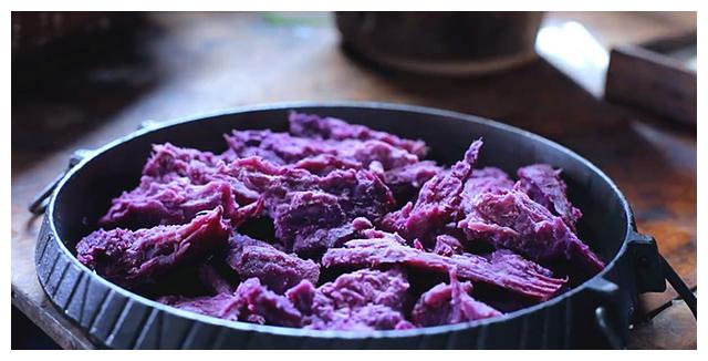 等到米糕蒸好以后,取出米糕,把荠菜拱蛋放进笼屉保温。把紫薯剥皮,掰成碎块,放入少许豆浆喝蜂蜜,然后搅拌成细腻的紫薯蓉。