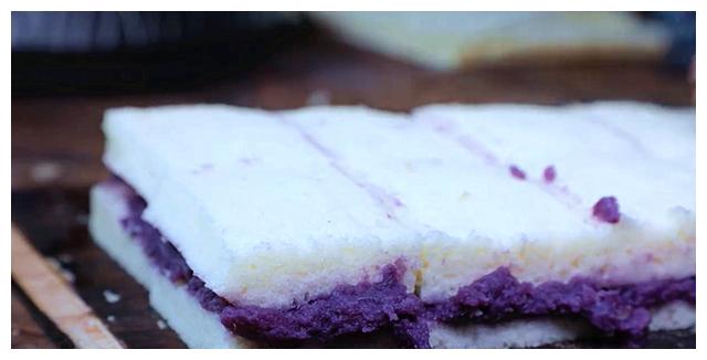 在取出米糕,从中间一切为二,紫薯蓉均匀涂抹在一份米糕上,然后把另一半米糕盖在紫薯蓉上,最后切成小方块。就这样一份紫薯米糕就做好了。