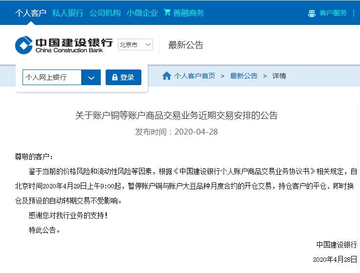 中国建设银行指出,鉴于当前的价格风险和流动性风险等因素,根据《中国建设银行个人账户商品交易业务协议书》相关规定,自北京时间2020年4月29日上午9:00起,暂停账户铜与账户大豆品种月度合约的开仓交易,持仓客户的平仓、即时换仓及预设的自动转期交易不受影响。