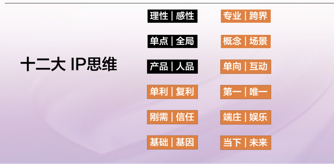 第十二,未来思维。IP是企业面向未来的深度布局,需要有洞穿时空见证未来蓝图的前瞻性思维。如何预测未来?这里有几点与大家分享共勉。一是识别趋势,能否打造一个具有未来感的IP一定要站在宏观高度去看待,国家宏观政策的调控是影响未来市场风向的关键因素;二是发现规律,打造一个成功的IP都是遵循了一套底层商业逻辑,寻找到市场变化中不变的规律和本质,就能享受规律带来的机会和好处;三是布局当下,当下的量变引起未来的豹变,任何一个IP都不是一蹴而就产生的,赢在未来最好的方式,就是了解年轻群体的喜好,用他们的方式做未来的事情。