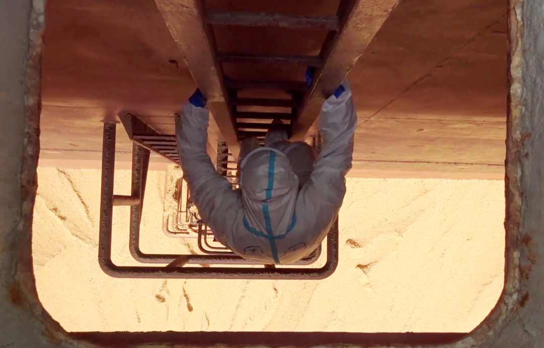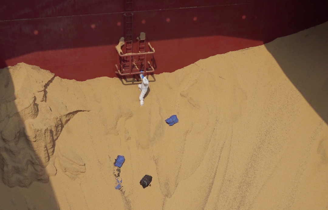 海关缉私警察深入万吨级大豆货舱搜查走私毒品。
